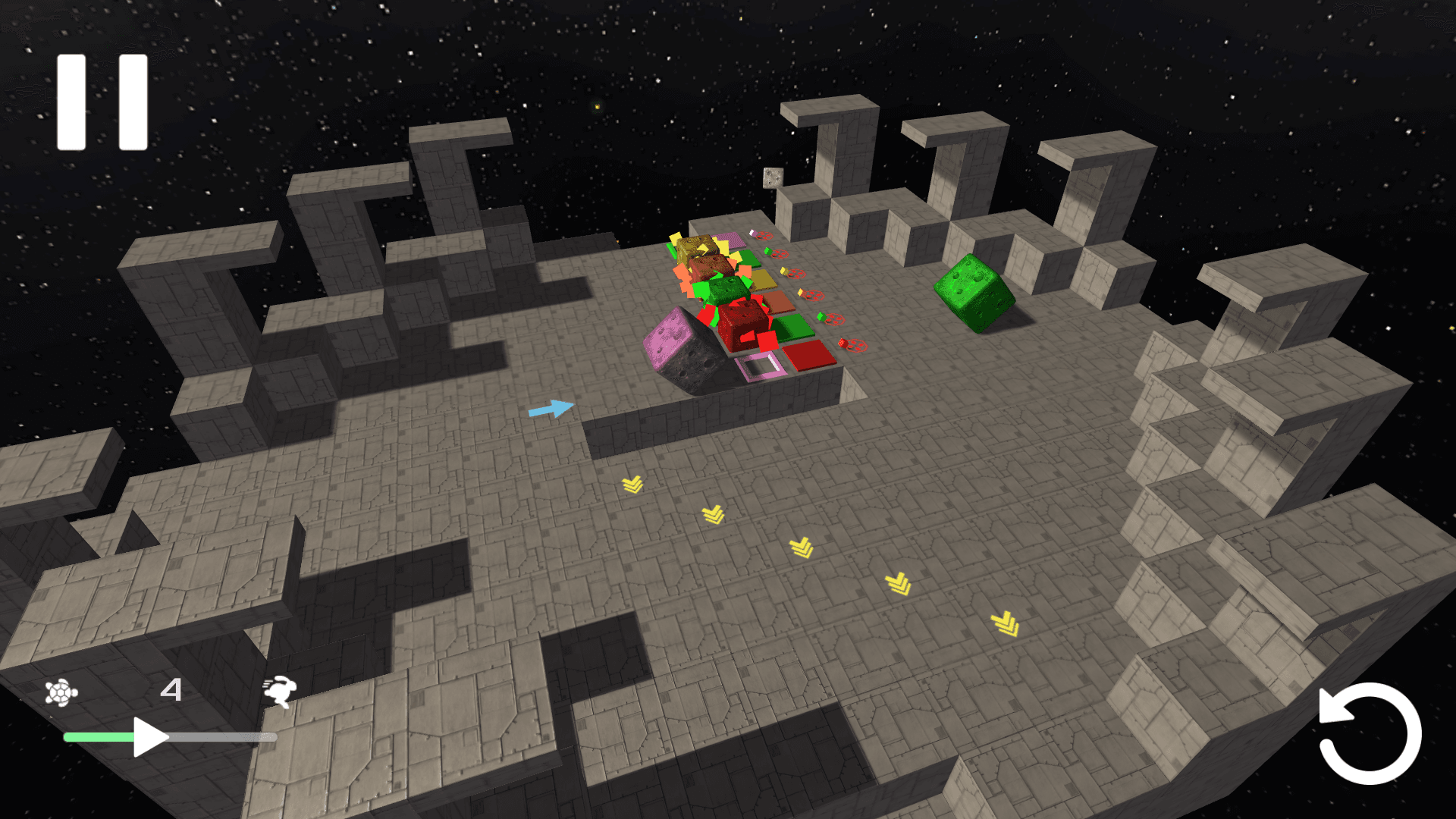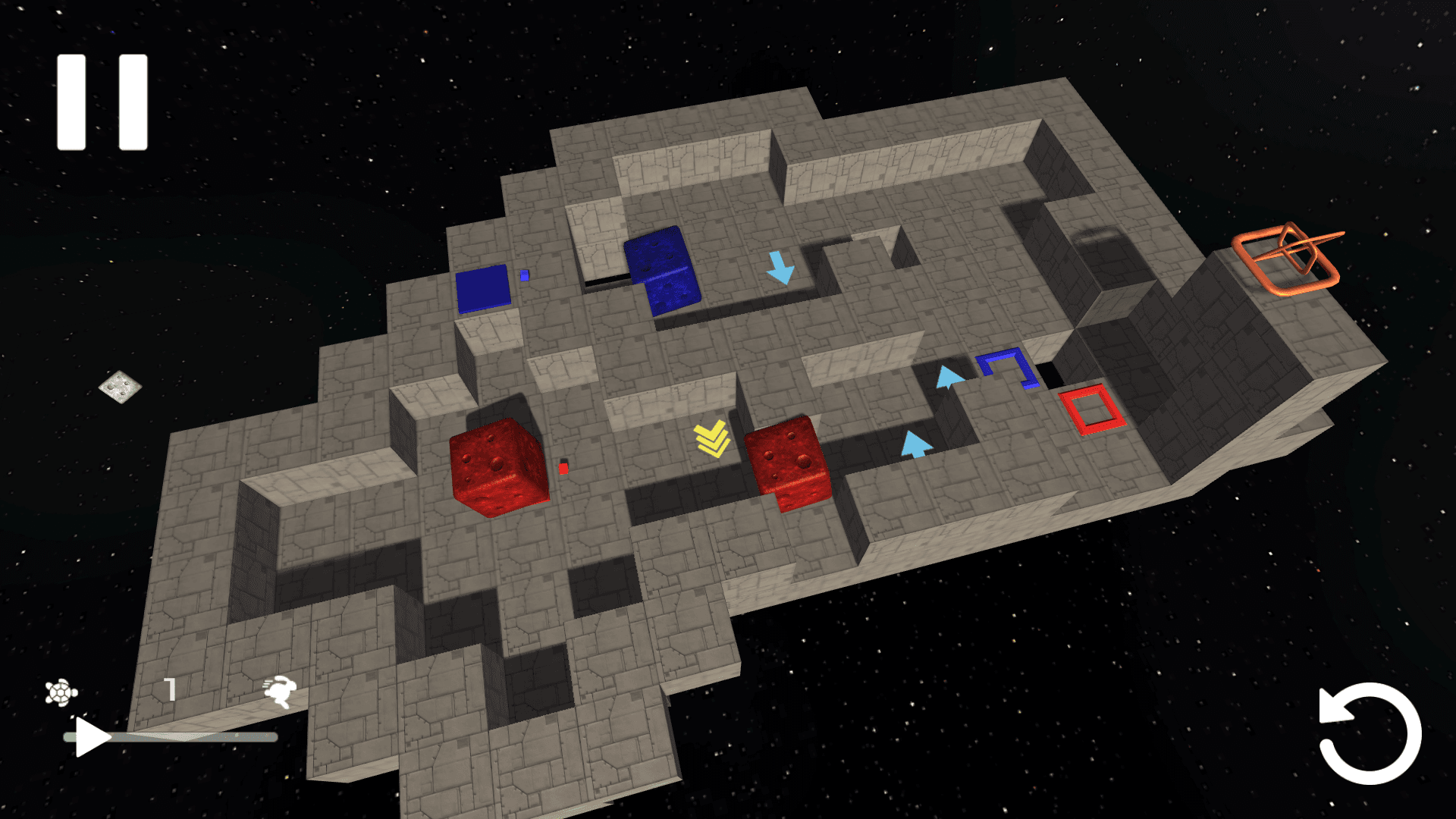 In this puzzle game, you're going to work on your visualization skills. Build the path to guide every cube to its destination, but be careful not to create a collision! There are two phases in this game. The first one is the building step where you place all your modifier blocks to move, rotate, or even teleport your cubes! After you're done, you can press play and check if your solution is correct or not, and retry if you need to.